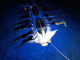 皆んなで板につかまりポイントまではすぐ目の前。特に泳力はいりません。幻想的な夜の海へ、マンタの優雅な舞は癒される時間。目の前を舞うマンタにうっとり。